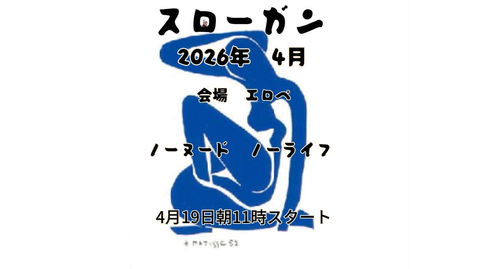 2026 4/19 スローガン「ノーヌード ノーライフ」2026.4.19スローガン2026年4月「ノーヌード ノーライフ」 会場:エロぺ 2026.4.19 11時スタート Post Share Hatena Pocket RSS feedly Pin it イベント一覧